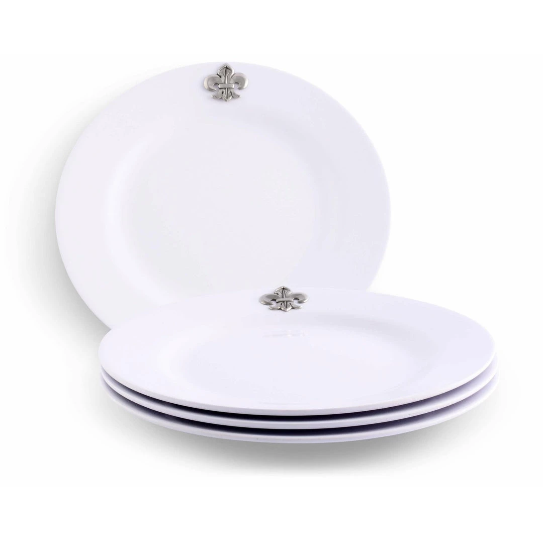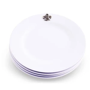 It is said that the best color for presenting food is white – and agrees! White dishes make food look more elegant and appetizing. Our pure white Melamine resin is durable, fire and heat resistant, and virtually unbreakable the perfect plate for outdoor dining. In true style, a detailed pewter metal Fleur de Lis is attached to the rim to create classic dinnerware that will stand up to outdoor use but is formal enough for indoor dining.