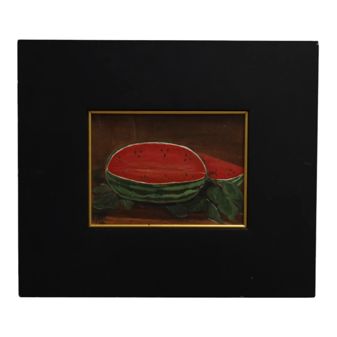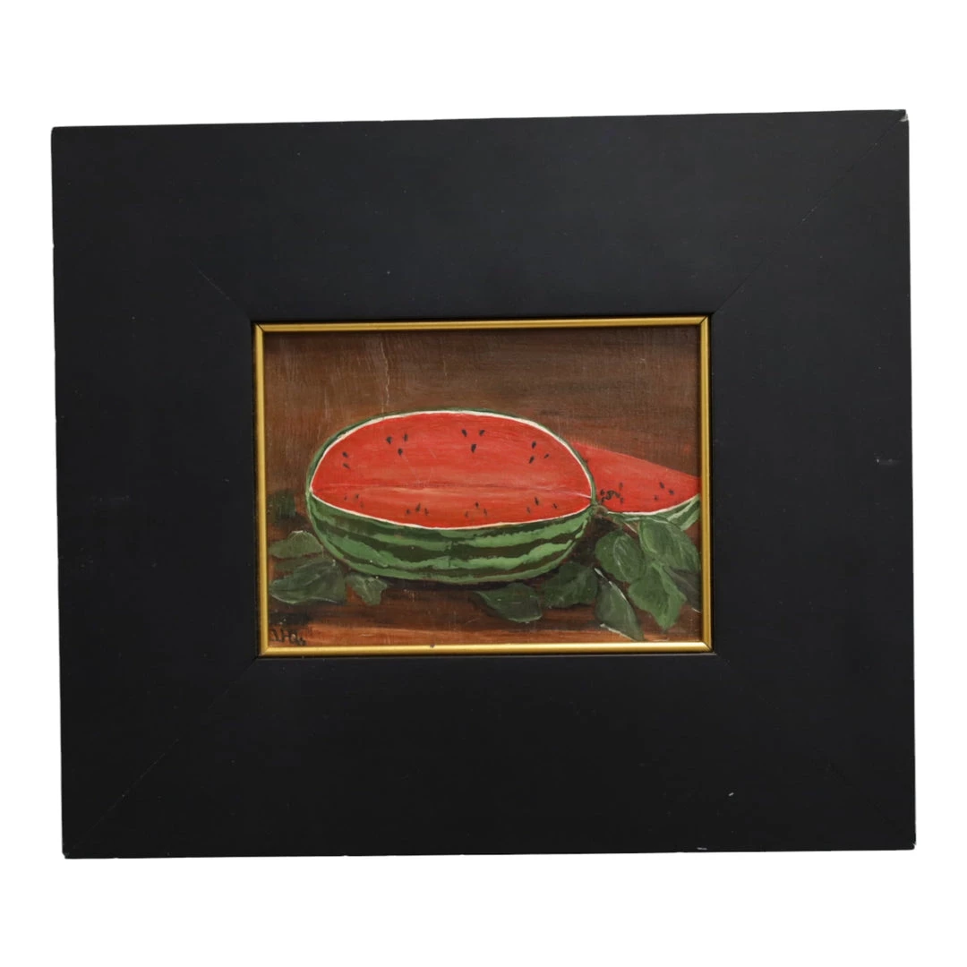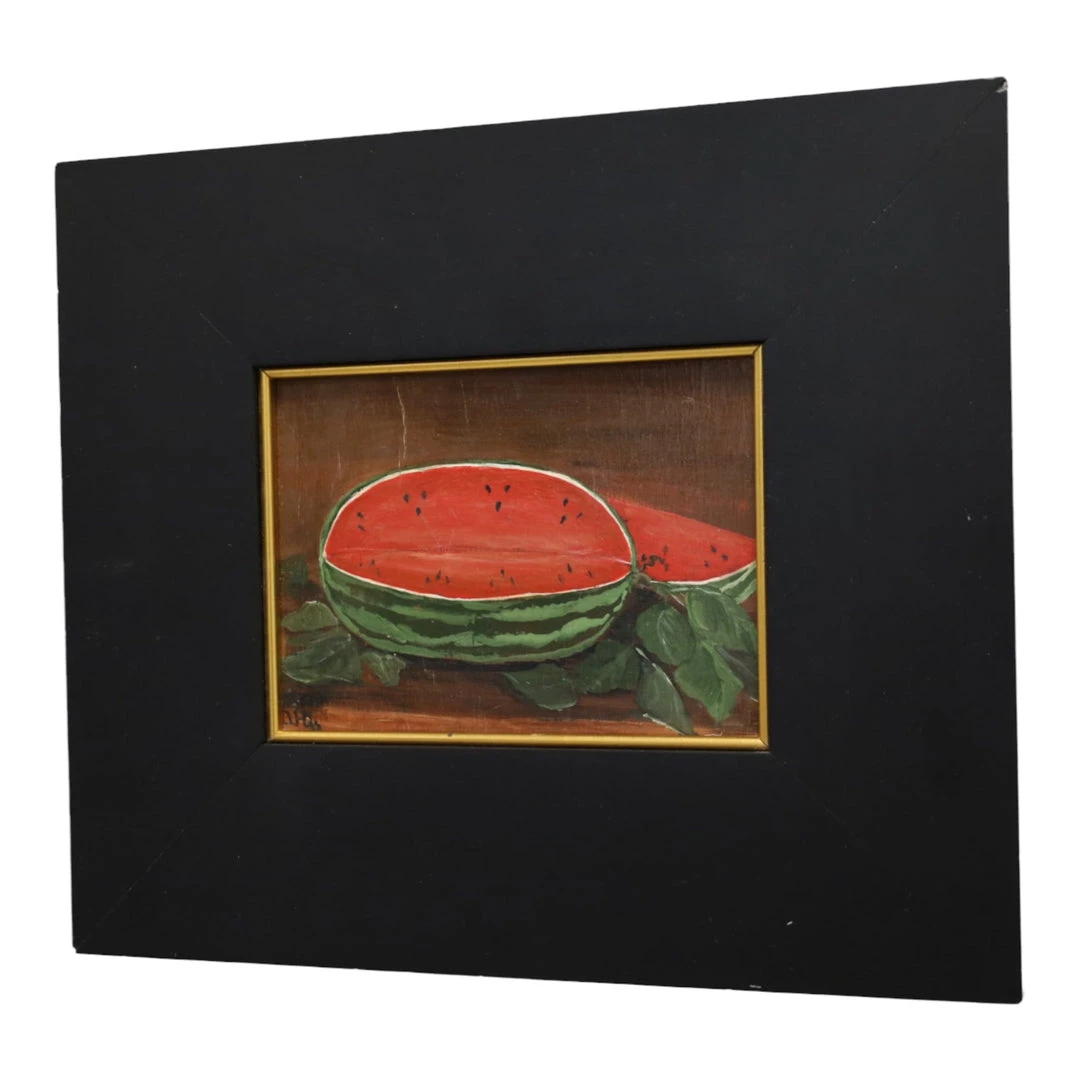 Antique painting early 20th century of a watermelon of wood board, framed professionally in a black wood frame with Gold trim.