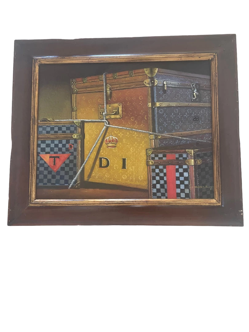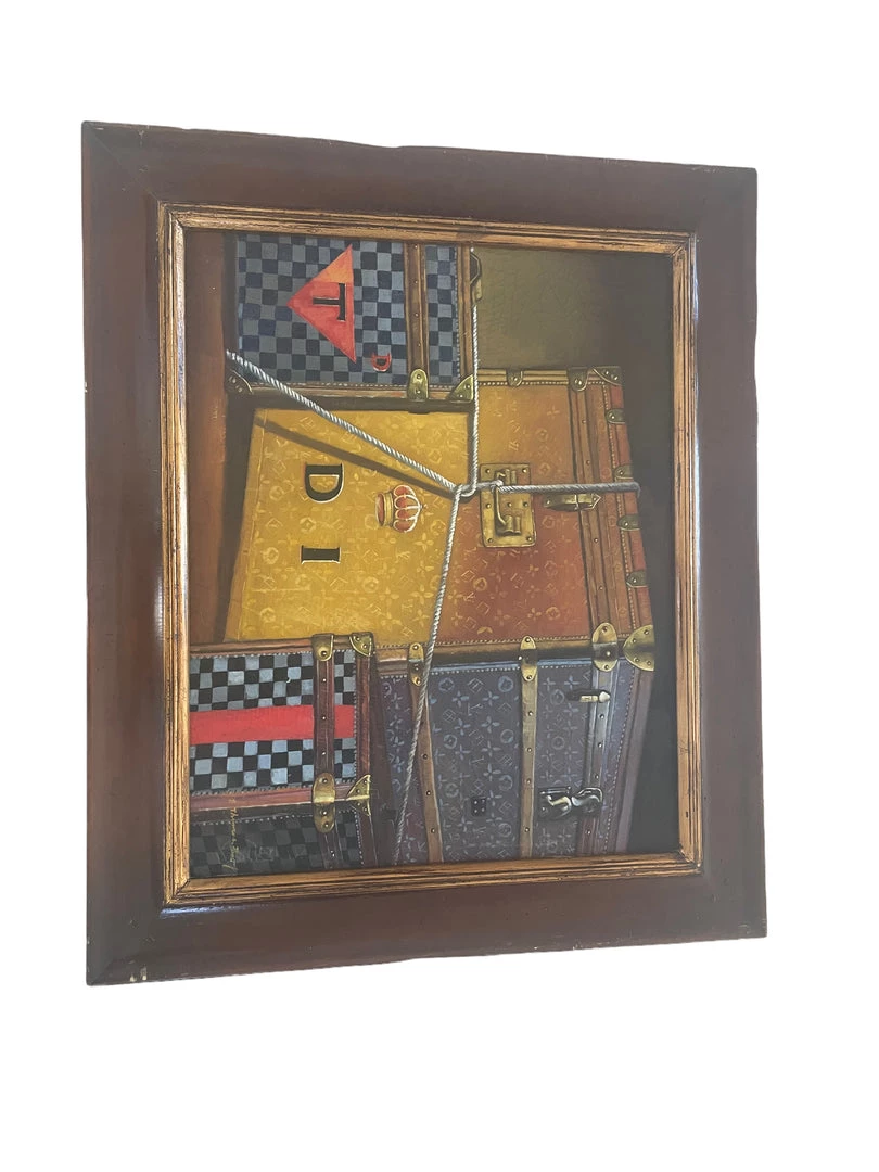 Vintage Steamer Designer Trunks Wall Art Painted on Canvas & Framed in Dark Walnut.