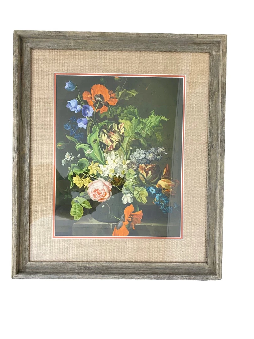 This professionally framed floral print features a burlap matte and warm gray frame.