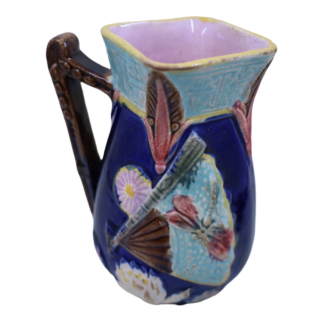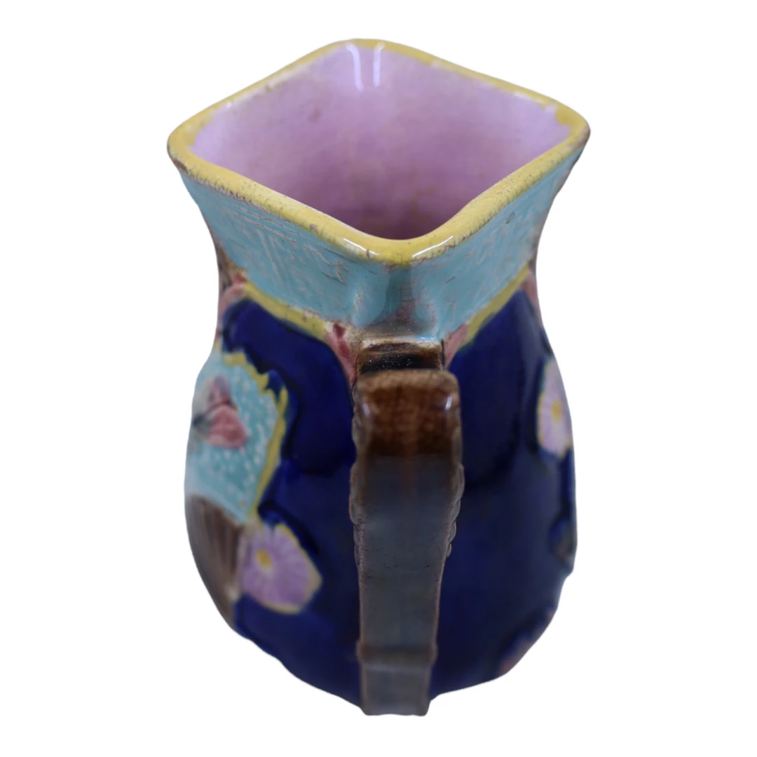 A beautiful myriad of exteriorcolors, with a striking cobalt background, turquoise, pink and yellow, and of course, the pink interior. An antique piece for the discerning majolica collector. Small glaze flaking and crazing adds to the character and history of this piece. There is some slight flaking associated with age, please see pictures for condition.