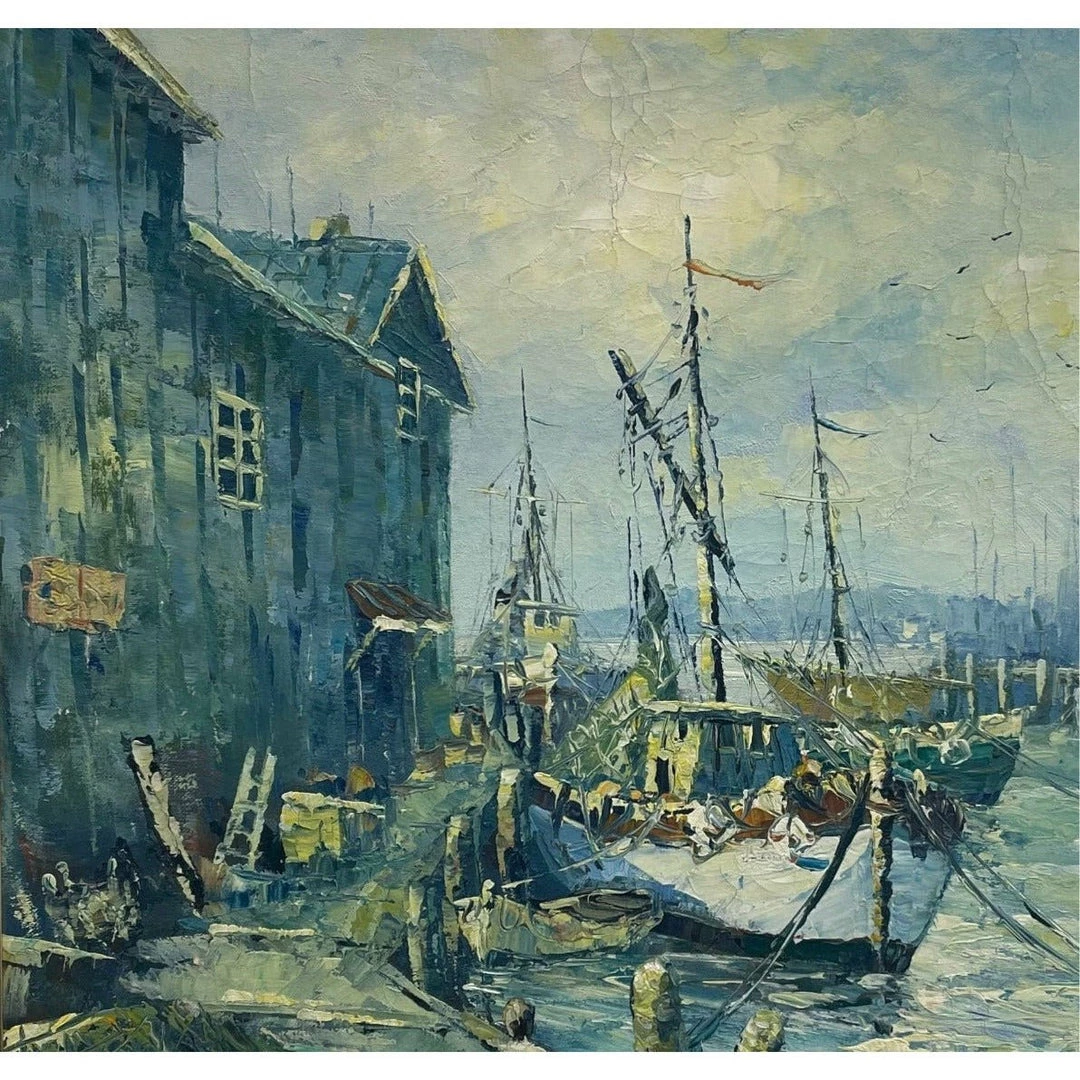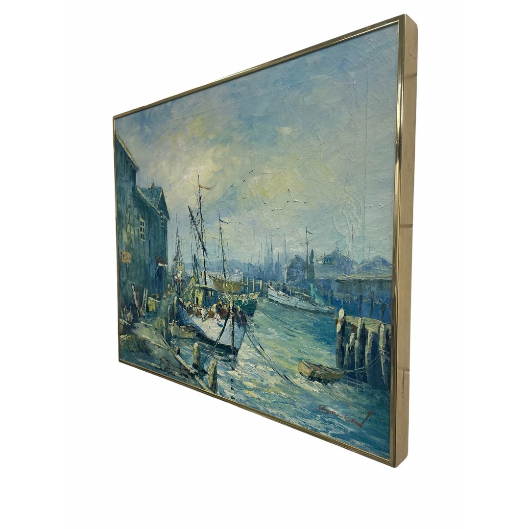 The painting depicts fishing boats in a harbor with a custom gold frame.