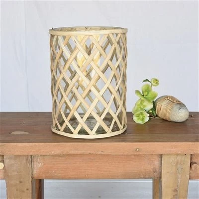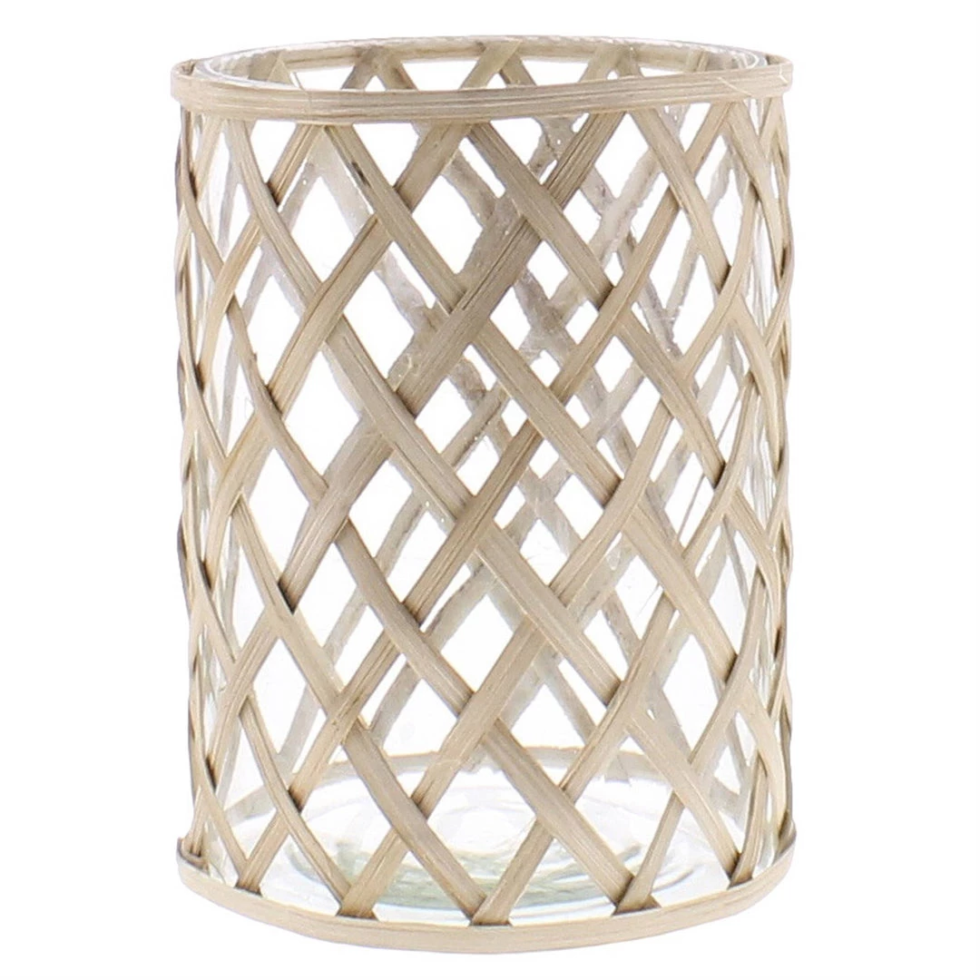 An intricate weave of thin bamboo dresses this clear glass vase made to house flower groupings and add warmth to any space.