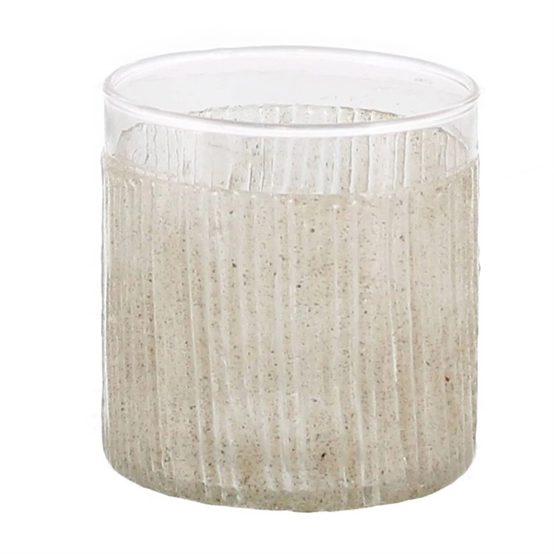 Earthen materials appropriated from nature are forever conserved in our Enamel Hurricane Collection. Sand is enameled onto simple glass silhouettes presenting an intriguing luminary for a candle or flower vessel.