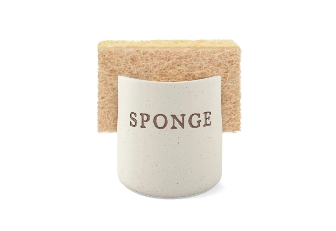 Free-standing crock, keeps your scrubbers elevated, dry and just a grab away.