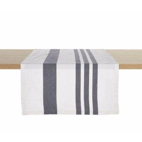 Named after a deep trench in the North Sea, Libeco’s linen/cotton collection is a plain weave white ground with irregular bastion blue stripes running through it.